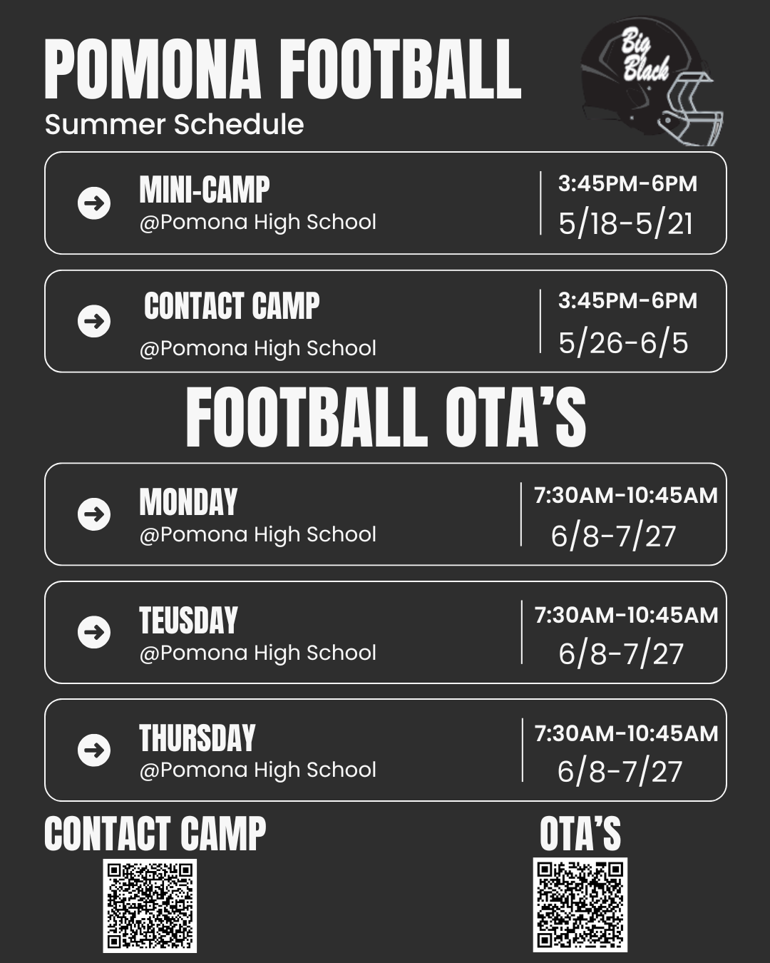 Camp Description: This camp will include full practices to install the offense and defense for the upcoming football season. It will also include a full scrimmage on last day of camp at Pomona HS on June 5th. The contact camp will be a full padded camp, and Coach Johnson will issue gear to all participants before camp starts. Please ensure you have a mouth piece.